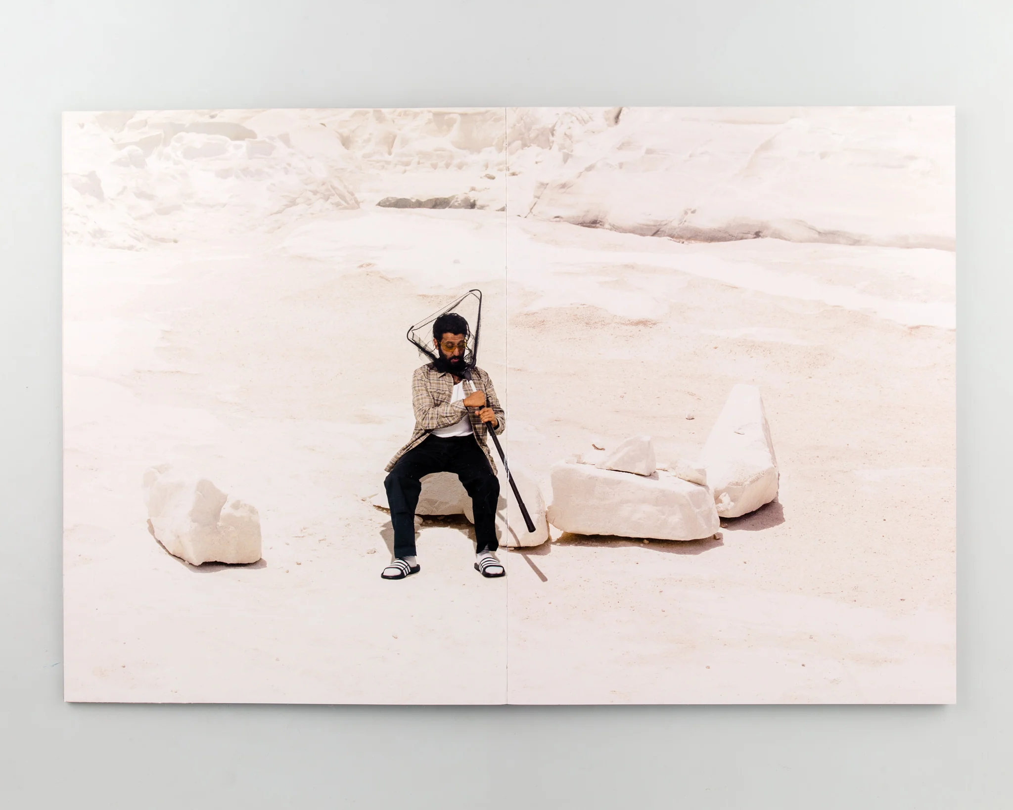 Rick Pushinsky’s new publication Basic Pleasure Model appears to begin as any Hollywood Sci-Fi blockbuster worth its salt might; with a rocket headed across star-studded galaxies straight towards Earth. As that rocket multiplies into several rockets, and then several more throughout the sequence of photographs, the book’s singular protagonist – a fictional character played by 2017 BAFTA award winning actor Adeel Akhtar – prepares diligently for the invasion. Costumed in an array of outfits including a suit, a weightlifting top and a karate belt, and wrestling with items such as hunting and fishing equipment, this man comes to signify the quintessential, yet increasingly obsolete, idea of hyper-masculinity as peddled in such mainstream films.